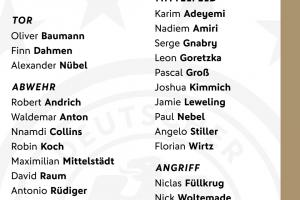 中场:阿德耶米(多特)、阿米里(美因茨)、格纳布里(拜仁)、格雷茨卡(拜仁)、格罗斯(多特)、基米希(拜仁)、勒威林(斯图加特)、内布尔(美因茨)、斯蒂勒(斯图加特)、维尔茨(利物浦)